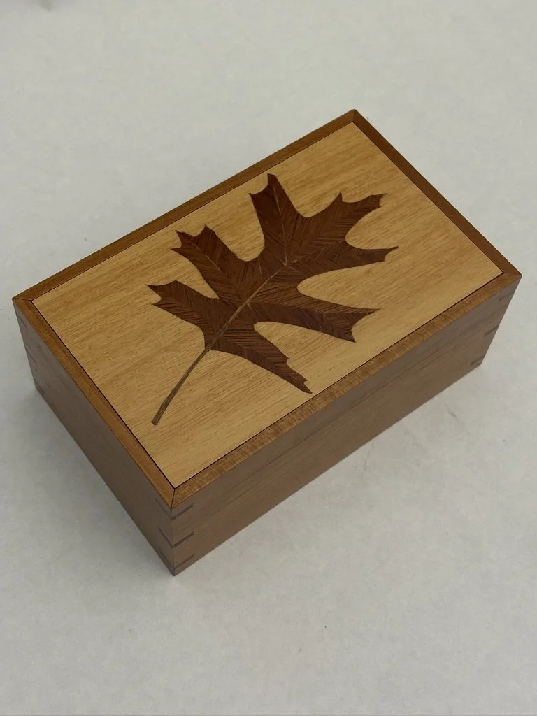The marquetry design on the lid of this box is intended to mimic an oak leaf I found on the ground in my neighborhood. This was an experimental project in which I tried to copy the veining of the leaf and its exact shape and size.