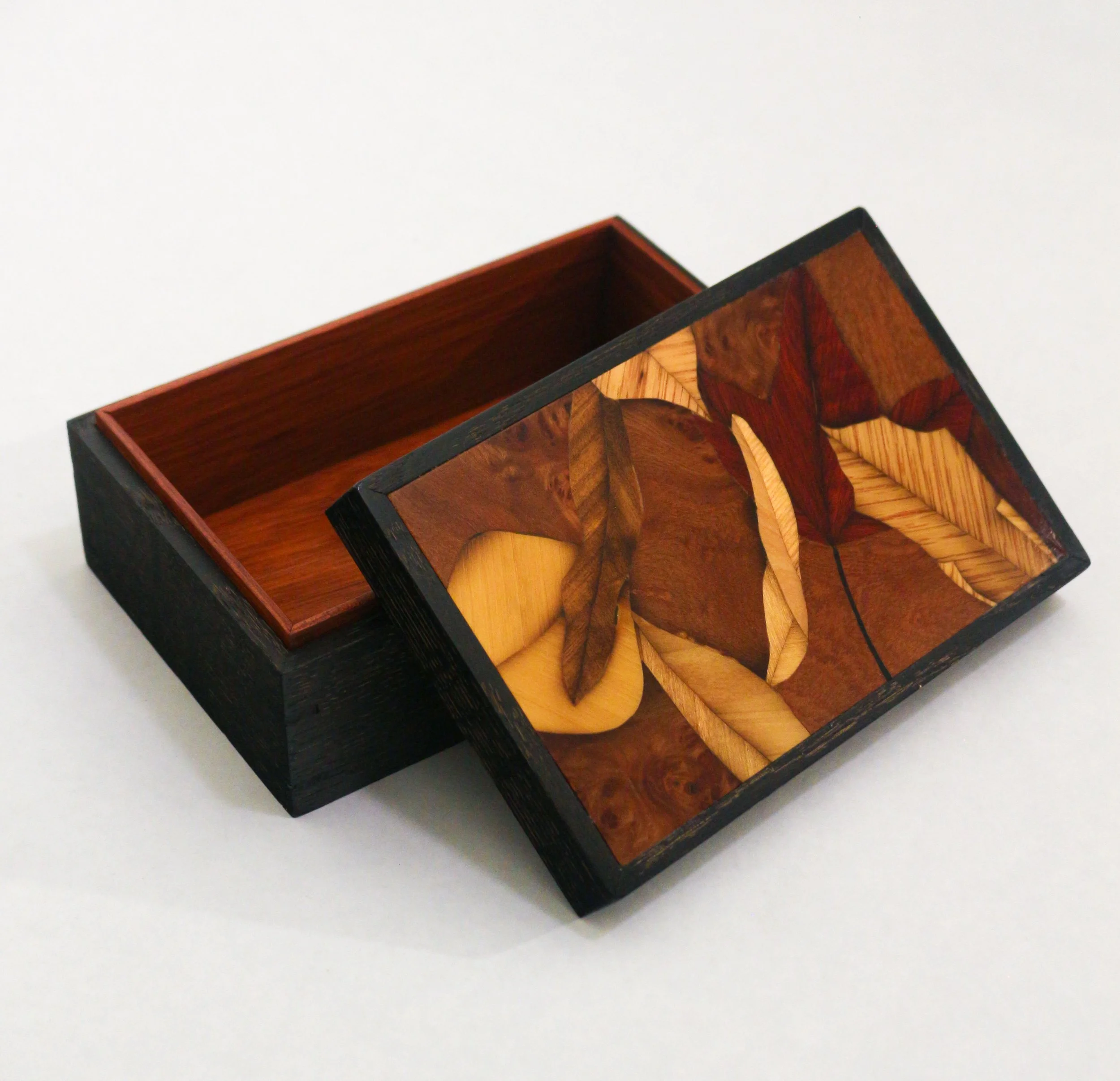 This marquetry box is made of ebonized white oak. The interior is lined with padauk. The marquetry design on the lid is evocative of a forest floor with fallen leaves. The veneers used include canary wood, oak, padauk, poplar, ash, birch, mahogany, Macassar ebony, and the ground is represented by a wood burl veneer.