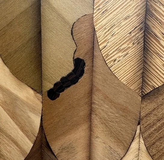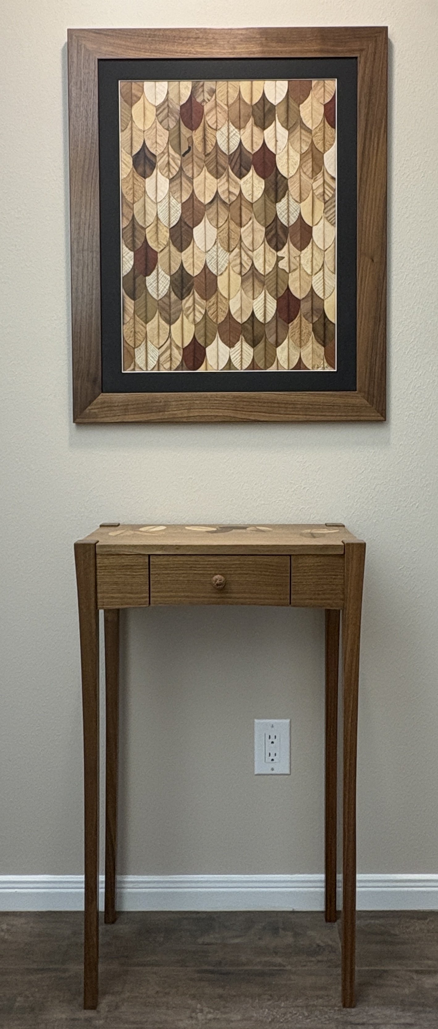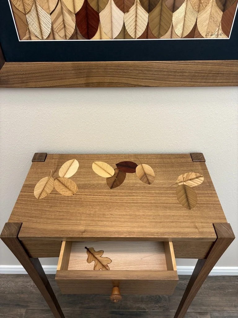 A marquetry abstract picture and accompanying table are perfect for the foyer of your home. Made from a wide variety of wood veneers, all their natural colors, this piece shows off the incredible variety of woods from all around the world. The table inlay is made from the same veneers and the drawer pull is an acorn