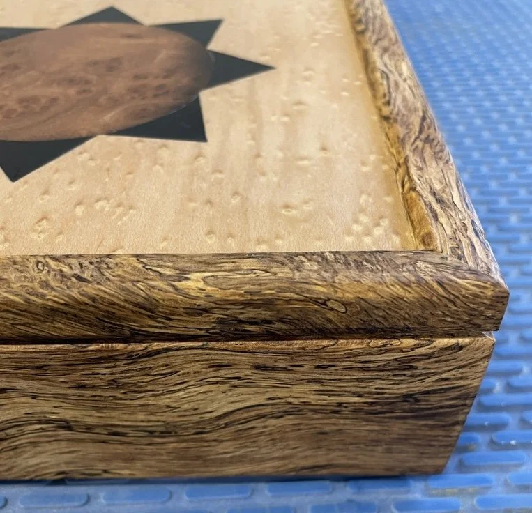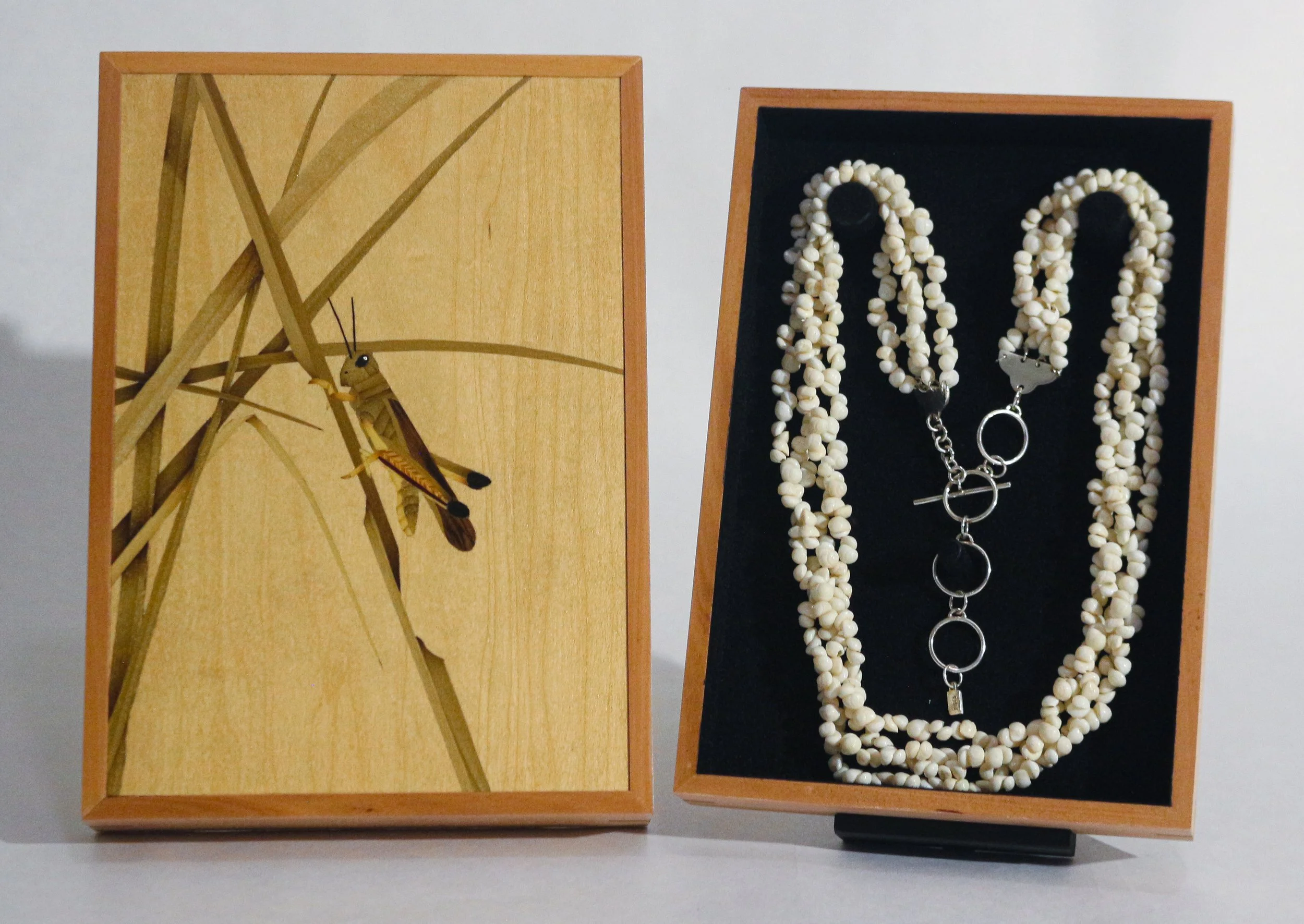 A jewelry box made from my neighbor’s elm tree which fell down during hurricane Beryl. The wood veneers used to make the grass and grasshopper design include maple, poplar, Macassar ebony, padauk, and canary wood. The sparkle in the grasshopper’s eye is a cubic zirconia.